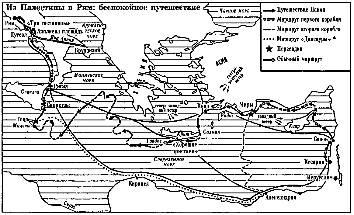 Обычно центурион, выполняющий роль стража порядка, старался передвигаться как можно быстрее и предельно обеспечить условия безопасности, используя подразделения официальных служб, осуществляя смену караула и перемещались по военным дорогам и на военных кораблях [1042] . В ту эпоху путешествовали обычно на каботажных или грузовых судах: центурион нашел в Кесарии небольшой торговый корабль, который совершал каботажные плавания вдодь берегов Сирии и Малой Азии и должен был подниматься до Лесбоса; ответственный за перевоз Павла чиновник надеялся сделать пересадку в пути, чтобы добраться в Рим. Проблема оказалась в том, что в конце сентября, после покаянного поста [1043] , было слишком поздно отправляться в путь: в это время уже начинались равноденственные штормы, и плавание по морю было запрещено с октября. Военные корабли уже не выходили в море, но частные лица могли идти на риск из-за заработка. В основном это были владельцы небольших и неудобных барок, как та, что досталась Павлу, которая шла вдоль линии берега, избегая двигаться прямо. Это первое плавание было очень долгим и часто прерывалось заходами в порты: в Сидоне — в Финикии, где Павел смог посетить своих друзей, затем в Мирах, где у него также были друзья [1044] .