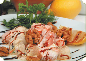Ингредиенты: 60 г. лосося, 60 г. белуги, 60 г. осетрины, 1 луковица, 1/4 стакана грецких орехов, 1 ст. л. оливкового масла, зелень.