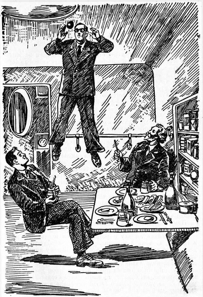 Тимчасом Гуро готував сніданок. Все устаткування каюти було механізоване й автоматизоване. Від легкого повороту рукоятки частина стіни каюти беззвучно впала на важелях вниз, створивши невеликий стіл. В отворі стіни з’явився буфет, де на полицях стояли пляшки дивної форми, коробки і бляшанки з консервами. Пружинистими кільцями закріплювались на столі прибори — тарілки й чашки своєрідної форми. Так само спеціальні пристрої затискували виделки й ножі. Ложок не було зовсім.