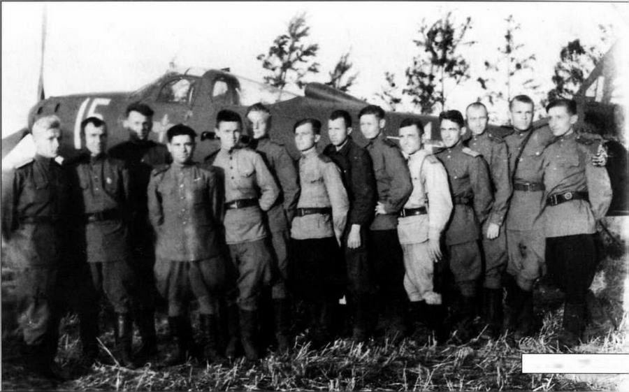 Вверху: эскадрилья ст. лейтенанта Деева (стоит 2-й слева), лето 1944г. (1-й справа Кармин В.Г., 2-й справа Митусов А. И.);