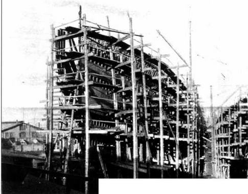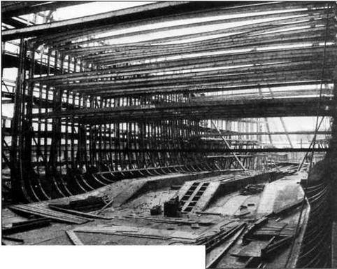 "Дойчланд" в процессе постройки на верфи "Вулкан". На фотографии хорошо видны фундаменты паровых машин
