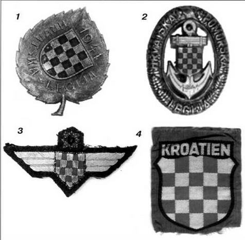 Почетный знак Хорватского пехотного легиона (1); почетный знак Хорватского морского легиона (2); почетный знак Хорватского авиационного легиона (3); нарукавный щиток аля личного состава хорватских добровольческих формирований в составе германских вооруженных сил (4)