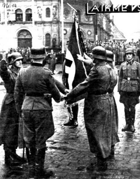 Фотография того, как латыши проносят присягу в Риге 29 марта 1943 года украсила собой обложку журнала «Лайкметс»