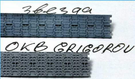 Сравнение траков из набора с продуктом фирмы ОКВ Grigorov (внизу), говорит не пользу первых