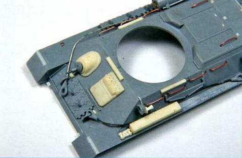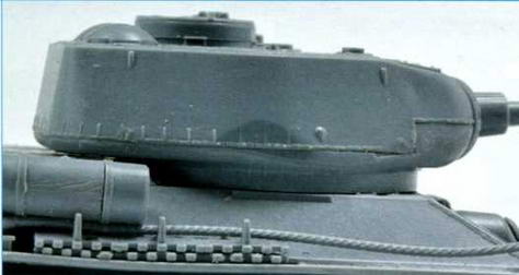 Задняя часть башни с шестью скобами под укладку брезента и поручнем для десанта и совершенно лысая часть модели. Обратите внимание на размер и форму рымов по краям башни