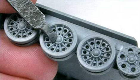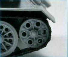На модели представлены «слайдеры» позднего типа, поэтому я срезал зачатки болтов на ступицах, поскольку планировал делать Т-34/85 военного периода