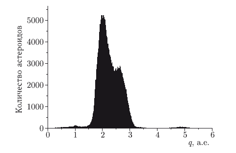 Рис. 3.5. Распределение астероидов по величине перигелийного расстояния в интервале до 6 а.е.