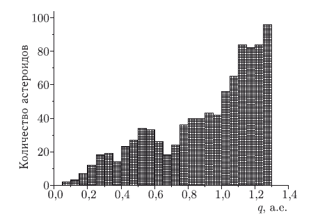 Рис. 3.6. Распределение крупных АСЗ (с абсолютными звездными величинами H < 18m) по величине перигелийного расстояния