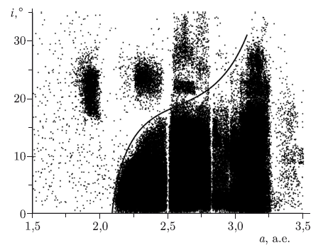 Вековые резонансы возникают при совпадении или почти совпадении средних движений перигелиев и/или узлов орбиты малого тела и орбиты возмущающего тела. Вековые резонансы приводят к сильным возмущениям эксцентриситета и/или наклона орбиты малого тела с очень долгими периодами, которые могут достигать десятков и сотен тысяч лет. Результат влияния вековых резонансов на элементы орбит астероидов можно наблюдать при сопоставлении элементов орбит большого числа тел. Вековые резонансы ограничивают область фазового пространства, в котором располагаются элементы орбит малых планет, а в ряде случаев рассекают ее на части. Вековые резонансы также причастны к переносу вещества из пояса астероидов в область внутренних планет [Knezevic and Milani, 1994]. В частности, у внутреннего края Главного пояса астероидов в окрестности значений большой полуоси a = 2,1 а.е. доминирует вековой резонанс 6 (совпадение средних движений перигелиев орбит астероида и Сатурна; к нему имеют отношение также вековые осцилляции эксцентриситета орбиты Юпитера). Его расположение в поясе слабо зависит от эксцентриситета, но сильно зависит от наклона орбит: при наклонах, меньших 10°, он проходит в окрестности 2,1 а.е. При больших значениях наклона область его действия смещается в сторону увеличения больших полуосей (рис. 3.11).
