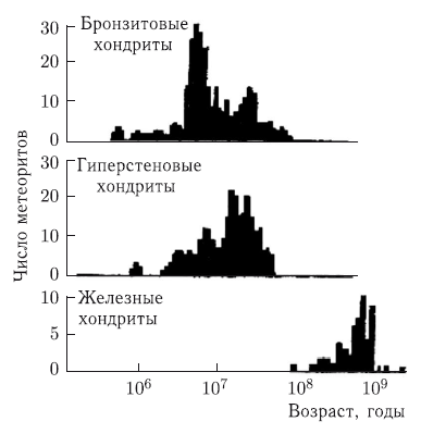 Рис. 3.12. Космические возрасты каменных и железных метеоритов [Вуд, 1971]