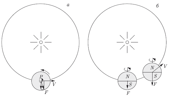 Различают суточную и сезонную составляющие эффекта [Bottke et al., 2002a]. Cуточная составляющая зависит от вращения тела вокруг оси, не лежащей в плоскости его орбиты. При этом из-за тепловой инерции вещества вечерняя половина тела оказывается более нагретой лучами Солнца по сравнению с утренней. Наиболее высокая температура поверхности достигается не в точках, где Солнце находится в меридиане (т. е. не в полдень), а в точках, чей местный меридиан повернут относительно меридиана подсолнечной точки на некоторый угол к востоку или западу в зависимости от направления вращения тела. Нагретое тело излучает тепло. Тепловые фотоны, покидая тело, сообщают ему некоторый импульс. Если бы температура поверхности сферически симметричного тела была всюду одинаковой, то усредненный результирующий импульс был бы равен нулю. Из-за различия температур в различных точках результирующий импульс отличен от нуля, причем из-за вращения тела он направлен не в сторону, противоположную Солнцу, а под некоторым углом к этому направлению (рис. 3.13 а). Его действие аналогично реактивному эффекту истечения газов из ядра кометы при нагревании его солнечными лучами. В зависимости от направления вращения ядра по отношению к направлению орбитального движения эффект Ярковского, подобно негравитационному эффекту в движении кометы, может вызывать как ускорение орбитального движения тела (сокращение большой полуоси), так и замедление