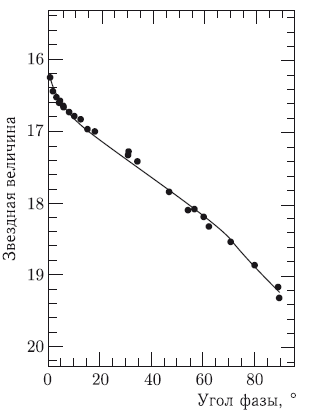астероиды Главного пояса могут наблюдаться лишь при относительно небольших фазовых углах, приблизительно до 30°.До 80-х гг. XX в. считалось, что добавление в формулу (3.4) слагаемого, пропорционального величине фазового угла, позволяет достаточно хорошо учесть изменение блеска в зависимости от угла фазы: