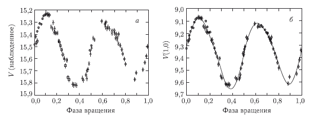 Обычно невозможно пронаблюдать весь цикл изменения блеска астероида в течение одной ночи, но в этом нет необходимости. На график наносятся точки, полученные в разные ночи, и по ним строится световая кривая. Если при этом периоды наблюдений разделены достаточно продолжительными интервалами времени, то при построении световой кривой учитывается изменение блеска, связанное с вариацией взаимных расстояний и взаимных положений Солнца, Земли и астероида за время между сериями наблюдений [Harris and Lupishko, 1989]. Световая кривая, полученная таким образом, называется композиционной (рис. 3.18 б) [French, 1987].