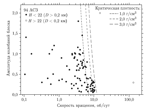 Справа от линий критических скоростей на рисунке располагаются только два астероида. С учетом данных [Pravec et al., 2000] их пять. Размеры всех пяти астероидов лежат в пределах от 30 до 130 м, а периоды обращения — в пределах от 2,5 мин до 97,2 мин. Такие скорости вращения означают, что эти тела представляют собой монолитные образования, которые сохраняют целостность при быстром вращении за счет сцепления между частицами вещества.