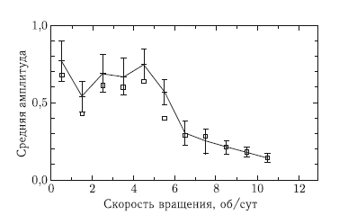 Еще одной примечательной особенностью АСЗ с размерами от нескольких сотен метров до 10 км является корреляция между амплитудой колебаний блеска и скоростью вращения. На рис. 3.23 представлено среднее значение амплитуды колебаний блеска для таких астероидов в зависимости от скорости вращения. Вертикальными черточками отмечены средние ошибки отложенных значений величины средней амплитуды. Начиная со значения 5 оборотов в сутки намечается устойчивая тенденция к уменьшению средней амплитуды колебаний блеска. Эта тенденция, как и ранее рассмотренные особенности, свидетельствует в пользу того, что быстро вращающиеся астероиды представляют собой агрегаты слабо связанных обломков. Можно думать, что по мере увеличения скорости вращения сила, прижимающая обломки друг к другу, уменьшается, что ведет к их большей подвижности и постепенному уменьшению отношения самой большой из полуосей фигуры астероида к двум другим.