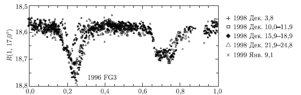 Рис. 3.24. Долгопериодическая составляющая кривой блеска АСЗ 1996 F G3 [Pravec et al., 2000]. По вертикальной оси отложен блеск в лучах R, приведенный к единичным расстояниям от Земли и Солнца и углу фазы, равному 17°