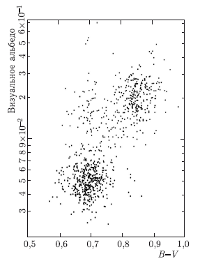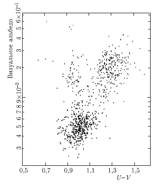 На рис. 3.25 и 3.26 хорошо заметно, что распределение колор-индексов, как и распределение альбедо, имеет бимодальный характер. Одна группа «красноватых» астероидов, концентрирующаяся вверху справа, имеет большие значения колор-индексов и сравнительно большие альбедо. Другая группа астероидов внизу слева имеет существенно меньшие значения колор-индексов и небольшие по величине альбедо. Эта корреляция позволяет путем достаточно легко выполняемого определения колор-индекса астероида получить некоторое представление о его альбедо и, следовательно, о его фотометрическом диаметре (если определены элементы орбиты и произведена оценка абсолютной звездной величины астероида). Кроме того, знание колор-индекса, как это будет видно в дальнейшем, позволяет сделать предварительное заключение о вероятном минералогическом и композиционном составе астероида.