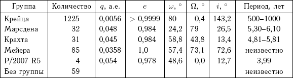 Примечание. Приведены параметры средних орбит для каждой из групп: q — перигелийное расстояние, e — эксцентриситет, — аргумент перигелия, — долгота восходящего узла, i — наклонение орбиты.