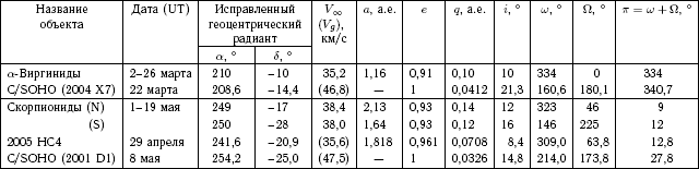 Примечание. Теоретический кометный радиант дан для сближения кометной орбиты с земной при Все угловые величины для кометы даны на эпоху 2000,0, для метеорного роя — на эпоху 1950,0.