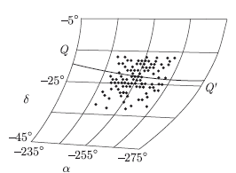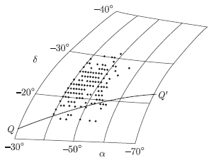 Рис. 4.24. Распределение радиантов радиометеоров, связанных с семейством Марсдена (QQ' — эклиптика) [Терентьева, Барабанов, 2008]