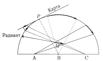Рис. 5.2. Слева: вид траектории, спроектированной на небесную сферу и на карту. M — стрелка в центре — след метеора в атмосфере; A, B, C — наблюдатели на поверхности Земли, расположенные в одной плоскости с метеорным следом; полукруг — сечение небесной сферы этой плоскостью; стрелки на полукруге — видимые следы на небесной сфере для каждого из наблюдателей; P — полюс мира. Справа: к понятию «радиант потока»