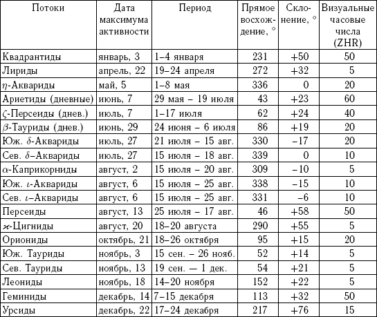 Метеороид, долетевший до поверхности Земли, называется метеоритом. Следует отметить, что несколько метеорных потоков с разными радиантами, наблюдающиеся в разное время года, могут иметь генетическую связь. Примером служит метеорный рой Квадрантиды. Подробное исследование эволюции орбиты этого роя показывает, что он имеет сложную форму и пересечение его с Землей, возможно, порождает и другие метеорные потоки, одним из которых является поток Аквариды, а другим — дневные Ариетиды. Данные о главных метеорных потоках приведены в табл. 5.1. На рис. 5.5 показаны орбиты некоторых из них.