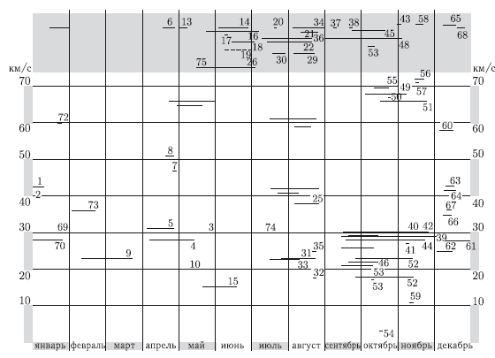 Для лучшей наглядности появления метеорных потоков в атмосфере Земли в течение календарного года данные наблюдений можно представить в виде диаграммы (рис. 5.7). Горизонтальная ось задает временную шкалу появлений (периоды активности) потоков по месяцам года, вертикальная ось — гелиоцентрические скорости (км/с) метеороидов, создающих данный метеорный поток. Из диаграммы видно, что в течение всего календарного года атмосфера Земли бомбардируется круглосуточно космическими «пришельцами» в фазе мелких и супермелких метеороидов. Крайне малые временные отрезки календарного года, в которые атмосфера Земли наименее подвержена активному воздействию метеорных потоков, скорее всего, определяют лишь несовершенство наших знаний.