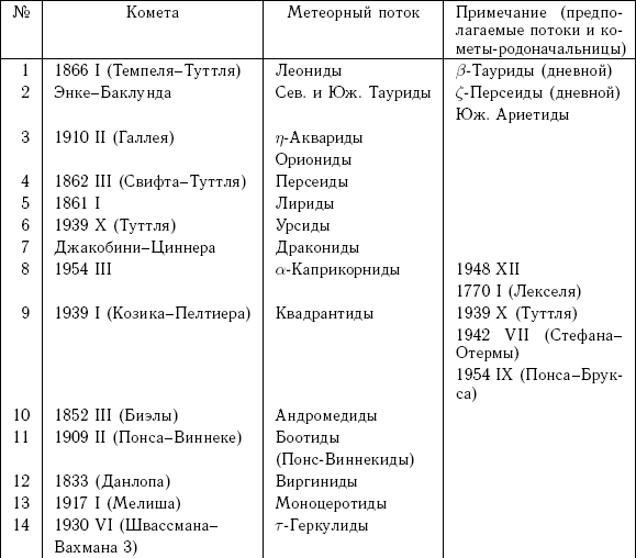 Рассматривая вопрос о связи комет и метеоров, следует помнить два других весьма важных фактора. Во-первых, существует много больших метеорных потоков, для которых пока нет возможности установить их связь с кометами. Во-вторых, существуют кометы, которые приближаются к Земле на расстояние менее 0,25 а.е. и должны были бы породить метеорные потоки, но таковых пока не обнаружено. Наиболее характерным большим метеорным потоком, не имеющим кометы-родоначальницы, является поток Геминиды. Несмотря на обстоятельное изучение, до последнего времени не удалось отождествить его связи ни с одной из известных комет. Некоторые из известных метеорных потоков и их предполагаемые кометы-родоначальницы представлены в табл. 5.5.