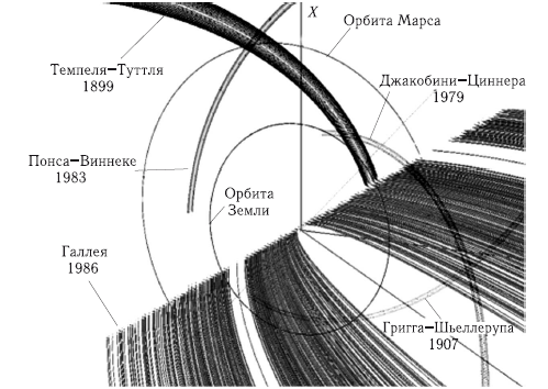 Солнцу, то в нем может быть выявлена продольная лучевая структура.К настоящему моменту разработана компьютерная технология для исследования возможности образования и дальнейшей эволюции метеороидных комплексов на значительных временных интервалах. Эта технология модульная. Одним из ее достоинств является принцип открытости и наращиваемости — фундаментальный принцип проектирования современных операционных систем. Это позволяет наращивать функции технологии и при необходимости легко заменять или расширять список применяемых алгоритмов. В последние годы опубликовано довольно много сведений о целом ряде малых небесных тел, наблюдавшихся в течение длительных промежутков времени, что позволяет проводить вероятностное моделирование на основе более или менее достоверных начальных данных. Так, диапазон наблюдений кометы Галлея (1910 II) охватывает 26 появлений с 1404 г. до н. э. по 1986 г. н. э., кометы Джакобини — Циннера — свыше 11 появлений, начиная с 1910 г., кометы Григга — Шьеллерупа — 18 появлений с 1907 г., комета Темпеля — Туттля II наблюдается с 1533 г., комета Понса — Виннеке — с 1819 г. и т. д. Такая ситуация позволяет использовать компьютерную технологию как один из способов изучения населенности ближнего и дальнего космоса фрагментами распада ядер родительских тел. На рис. 5.18 (см. вклейку) и 5.19 представлены некоторые результаты моделирования процесса дезинтеграции вышеперечисленных комет в определенные моменты их жизненного цикла и расположения в пространстве возникающих при этом метеороидных комплексов.