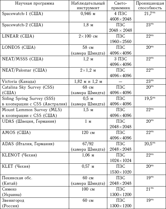 Таким образом, следующим шагом в изучении популяции потенциально опасных для Земли небесных тел является задача массового обнаружения объектов с размерами более 100 м. Для того чтобы обеспечить массовость обнаружения и выполнение задачи каталогизации 90 % тел с размерами свыше 100 м, необходимо построить телескопы обнаружения с проницающей способностью не хуже 24m и включить в программы мониторинга многие традиционные астрономические телескопы. Подробнее о перспективных средствах обнаружения таких тел см. в разделе 6.2.