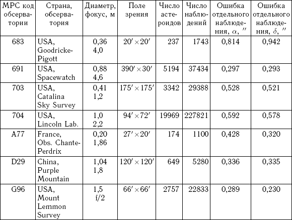 Представление о количестве наблюдений объектов, полученных на некоторых из указанных выше обсерваторий, и о точности определения их координат дает