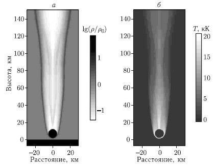 Результаты расчета для большого тела (диаметром 10 км) приведены на рис. 8.3. Картина распределения плотности и температуры в более поздние моменты времени показана