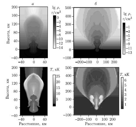 Рис. 8.4. Распределение плотности (верхняя панель) и температуры (нижняя панель) через 5 с (а) и 15 с (б) после удара о Землю каменного тела диаметром 10 км со скоростью 20 км/с