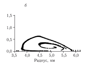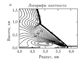 Рис. 8.10. (а) Распределение изохор в атмосфере после вертикального падения ледяного тела диаметром 200 м и скоростью 50 км/с в момент времени t = 1 с. (б) Положения начальных маркеров теплого слоя в тот же момент времени
