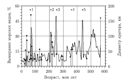 8.6.1. Статистика массовых вымираний. В последние десятилетия получены достоверные данные о массовых вымираниях биоты на протяжении последних 600 млн лет жизни Земли. На рис. 8.13 (по сводным данным) сплошной линией показан график вымираний морских видов (в %), точками — ударные кратеры на поверхности Земли, звездочками отмечены пять наиболее крупных вымираний. Причины этих пяти катастроф широко обсуждаются и до конца не ясны.