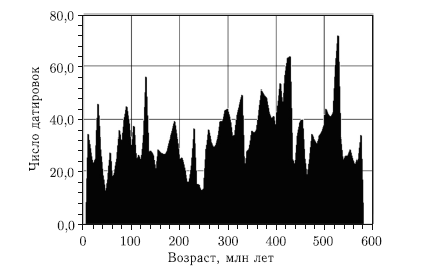 Кроме этих гигантских биокатастроф (Major extinction events) палеобиологи выделяют в фанерозое еще около 20 событий меньшего масштаба (Minor events). Ряд исследователей полагает, что до 10 % из последних могли быть вызваны ударами тел диаметром более километра. Как отмечено в главе 9, по оценкам вероятности столкновений с Землей небесных тел, частота падений астероидных тел и кометных ядер километровых размеров составляет 1 на миллион лет, 10-километровых — 1 на 100 млн лет. Таким образом, за указанные полмиллиарда лет могло быть до сотни крупных импактных событий, вызывающих региональные и субглобальные перестройки биосферы. Рисунок 8.14 иллюстрирует геологическую активность за тот же период (последние 570 млн лет).