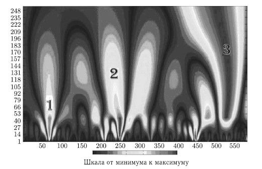 Рис. 8.15. Вейвлет-спектр временного ряда массовых вымираний морской фауны (виды) в фанерозое: 1 — около 65 млн лет назад («вымирание динозавров»), 2 — массовое пермо-триасовое вымирание, 3 — Кембрийский взрыв