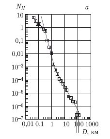 Как видно из рис. 9.1, в диапазоне от метровых до километровых кратеров зависимость числа кратеров от их диаметра имеет сложную форму, лишь кусочно соответствующую простым степенным соотношениям.