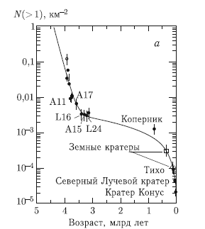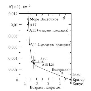 Рис. 9.2. Накопленное количество кратеров на различных участках лунной поверхности в зависимости от ее возраста, определенного по возвращенным лунным образцам: а) логарифмический масштаб по оси ординат, б) линейный масштаб по оси ординат.