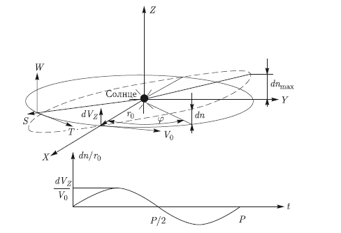 Сначала рассмотрим результат приложения малого импульса скорости dVZ, направленного по оси W, т. е. по нормали к плоскости орбиты астероида. Пусть импульс скорости прикладывается в момент нахождения астероида на оси X (рис. 10.1). Анализ показывает, что результатом является изменение наклонения орбиты небесного тела, а все остальные элементы орбиты остаются без изменения. При этом изменение движения астероида относительно первоначальной орбиты сводится к периодическим гармоническим колебаниям лишь по одной координате W. Для малого изменения орбиты колебания dn как функции времени t, отнесенные к радиусу орбиты r0, могут быть записаны в виде