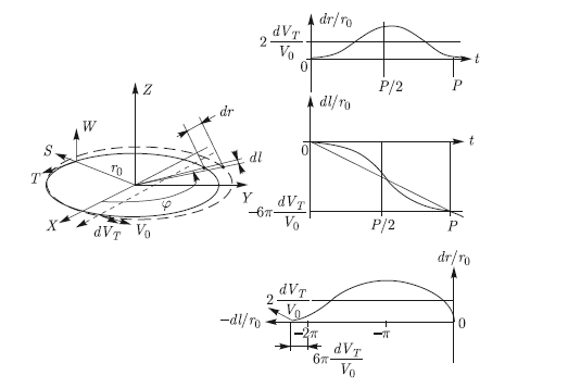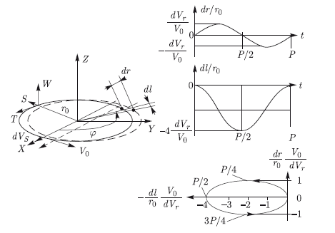 Обращаясь к производным, приведенным в работе [Эльясберг, 1965], сразу получаем, что небесное тело будет совершать периодические колебания dr, dl относительно текущего невозмущенного положения по радиус-вектору r (т. е. по координате S) и вдоль орбиты l (практически по координате T):