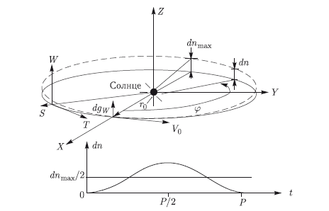 По оси T (вдоль орбиты) появился вековой уход астероида, линейно нарастающий со временем, суммирующийся с периодической составляющей. Величина этого ухода за один виток будет равна dl/r0 =-4(dgS/g0). Таким образом, получим удобные выражения для векового ухода за Nв витков и требующегося для этого ускорения: