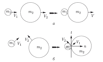 Абсолютно неупругим ударом называют такой удар, после которого скорости обоих соударяющихся тел оказываются одинаковыми. В случае абсолютно неупругого удара космический аппарат, ударяющий по астероиду со значительной относительной скоростью, доходящей до десятков км/с, просто внедряется в небесное тело, поглощается им и продолжает дальнейшее движение совместно с ним. Разумеется, удар на таких скоростях вызывает значительные побочные эффекты, однако к их рассмотрению целесообразно обратиться несколько позже. Если абсолютно неупругий удар централен (рис. 10.7 а), то, как известно из механики соударяющихся тел (см., например, [Хайкин, 1947]), при естественном здесь и далее предположении m1 << m2 имеем простое выражение для скорости астероида V после удара: