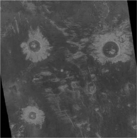 2.5.4. Кратеры на Венере. Венера окружена очень плотной атмосферой; ее плотность почти в 100 раз превышает плотность атмосферы Земли. Атмосфера Венеры непрозрачна и не позволяет увидеть какие-либо детали ее поверхности в оптическом диапазоне. Защитная роль ее атмосферы от внешнего (космического) воздействия подобна водному океану глубиной 1 км или слою скальных пород мощностью 300 м. Облик поверхности Венеры, выявленный с помощью космических аппаратов «Венера-15» (рис. 2.12), «Венера-16» и «Пионер-Венера», разительно отличается от облика Меркурия. На Венере очень мало кольцевых кратерных структур. На территории 115 млн км2, снятой радарной съемкой с высоким разрешением, выявлено всего около полутора сотен кратеров с поперечным размером до 150 км. Но глубина этих кратеров очень мала (несколько сотен метров). Мелкие кратеры с размерами менее 8 км отсутствуют. В связи с тем, что разрешающая способность радарных измерений низка, нельзя сделать окончательного вывода о соотношении вулканизма и космической бомбардировки в формировании ландшафта Венеры.