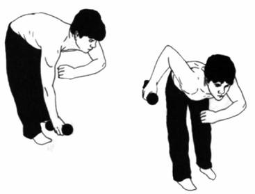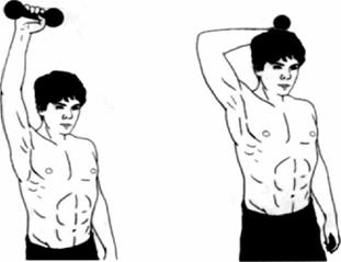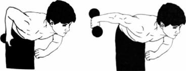 Наклонитесь над столом и упритесь в него рукой, другую руку держите согнутой под углом 90 градусов (рука выше локтя параллельна полу, ниже локтя - опущена вниз). Распрямите руку до горизонтального положения. Повторив N-ное количество раз, повторите упражнение для другой руки.