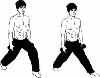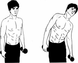 БОКОВЫЕ– держа гантель (или две) в руке, наклоняйтесь в противоположную сторону (правая рука - левая сторона и наоборот).