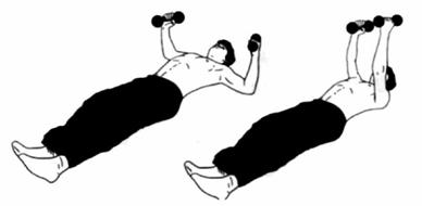 Выполняется лежа на скамье, руки согнуты в локтях, гантели на уровне груди. Поднимание гантелей.