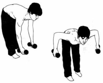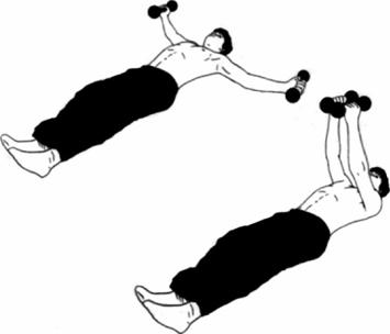 «Разводка». Положение то же, но руки прямые, расставлены в стороны, гантели ниже уровня груди. Поднимание гантелей (до их касания над грудью).