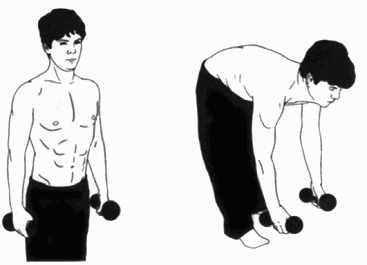 Держа гантели в руках, наклонитесь, чтобы они касались пола (или находились как можно ближе к нему). Выпрямитесь (руки опущены вдоль тела).