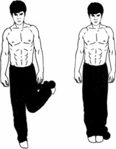 Стоя. Поднимайте ногу, сгибая в колене и тазобедренном суставе.